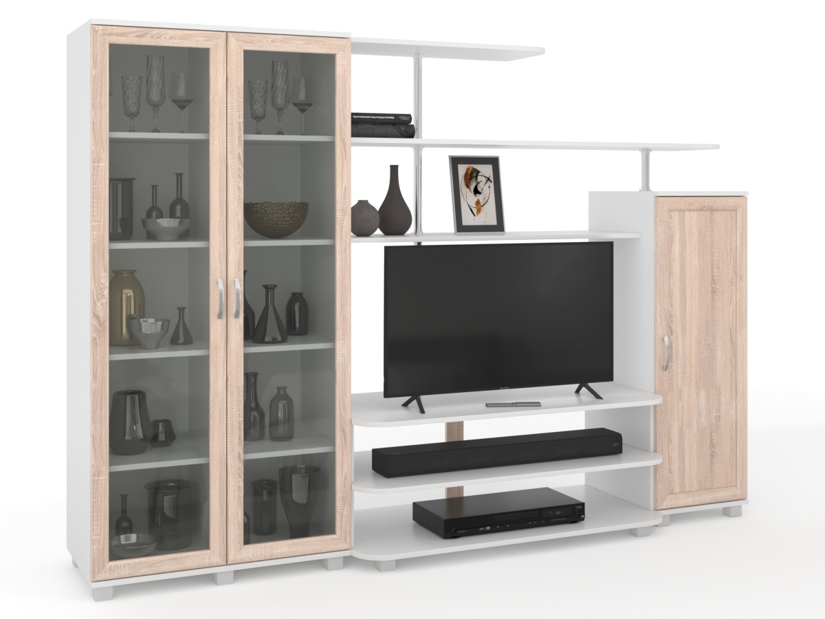 Стенка Бетховен 4 – прекрасный вариант для гостиной или спальни. Представляет собой двухстворчатый шкаф со стеклянными дверцами и полками внутри, несколько открытых полок разного размера и небольшой шкаф. Если разместить на открытых полках, например, комнатные растения, это придаст им эффект парения в воздухе. Широкий проём в центре доступен для размещения телевизора.