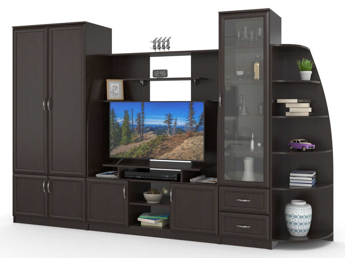 Изысканная Стенка Этюд-2, изготовленная в классическом стиле, позволит наполнить комнату атмосферой уюта и комфорта. Стенка изготовлена из ламинированного ДСП и МДФ, оборудована разнообразными полками, где можно разместить книги, элементы декора. Также предусмотрена тумба под телевизор, выдвижные ящики для хранения различных вещей. У нас можно заказать стенку различных цветов и размеров.
