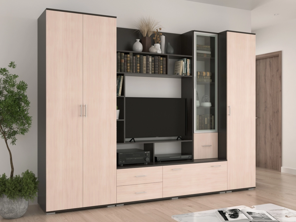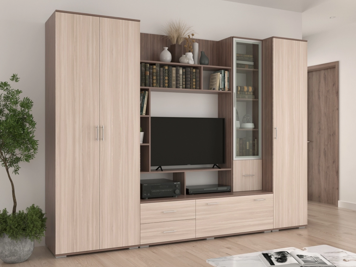 Стенка Калипсо 1 — привносит в пространство элегантную простоту. Стильная, современная и вместительная, она предоставляет множество вариантов для хранения. В ее состав входит просторный платяной шкаф, полки и ниши, одна из которых отводится под ТВ, витрина со стеклянной дверцей, удлиненная тумба и вместительный пенал.