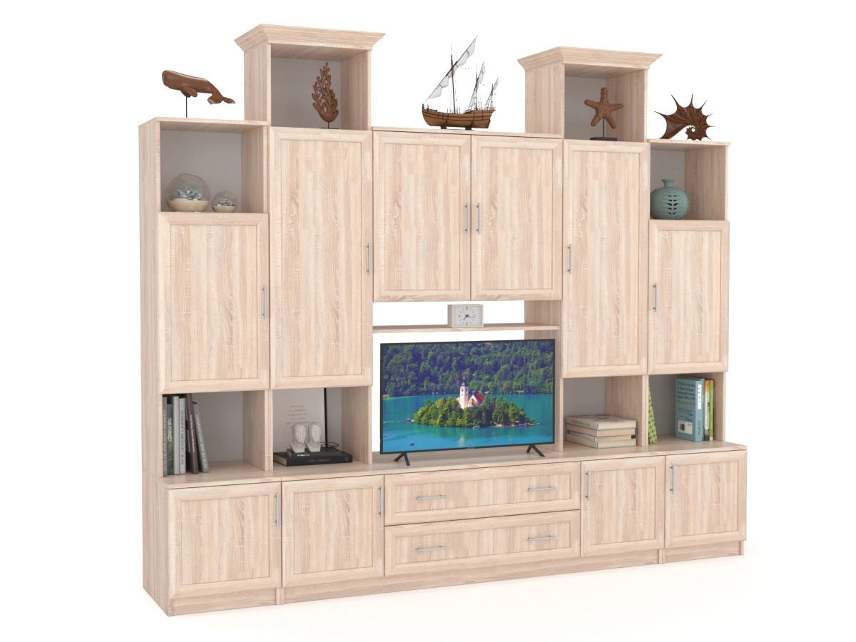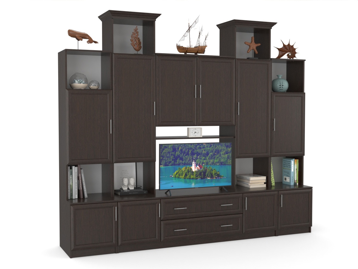 Стенка Клеопатра 8 — это современное понимание классики, в ее наилучшем исполнении. Сдержанная строгость фасадов удачно дополняется разным уровнем секций. Симметрия наделяет пространство четкой организованностью. На открытых полках эффектно могут расположиться красивые мелочи и телевизор, в закрытых небольших шкафах поместиться предметы с гораздо большей ценностью, в тумбах спрячутся полезные вещи обихода.