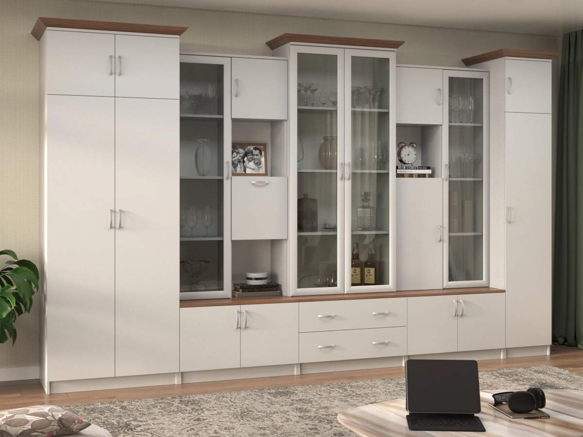 Стенка Композиция 11 — являет собой красивое и величественное изделие, созданное в соответствии с канонами производства современной классической мебели. При помощи элементов, имеющих разную высоту и выступающего ряда тумб создана элегантная, утонченная модель.