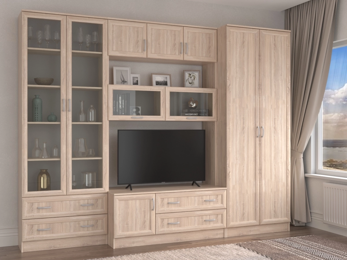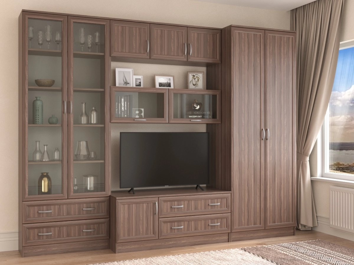 Изысканная Стенка Корсика-2, изготовленная в классическом стиле, позволит наполнить комнату атмосферой уюта и комфорта. Стенка оборудована разнообразными полками, где можно разместить книги, элементы декора. Также предусмотрена тумба под телевизор, выдвижные ящики для хранения различных вещей и двумя шкафами по бокам. У нас можно заказать стенку различных цветов и размеров.