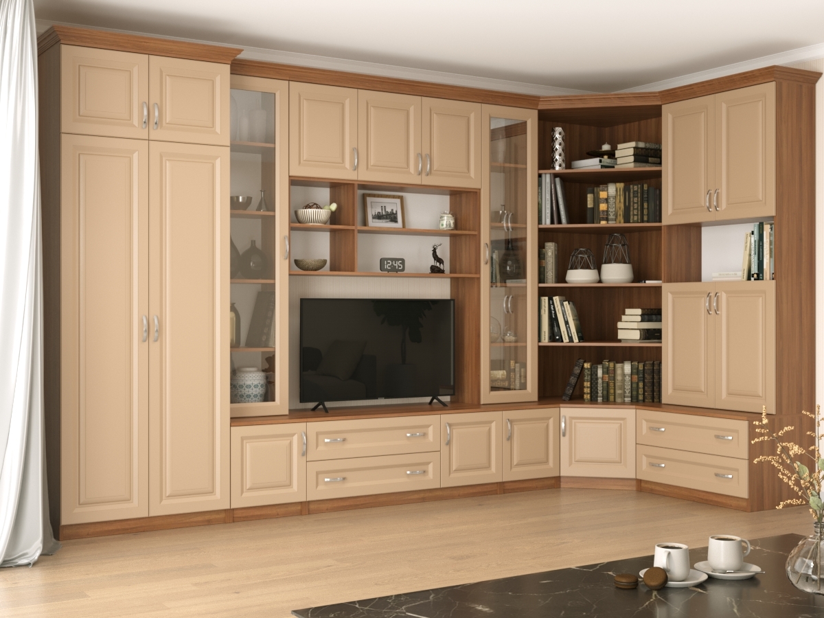 Изысканная Стенка Марина - 15, изготовленная в классическом стиле, позволит наполнить комнату атмосферой уюта и комфорта. Стенка изготовлена из ламинированного ДСП, оборудована разнообразными полками, где можно разместить книги, элементы декора. Выдвижные ящики для хранения различных вещей. У нас можно заказать стенку различных цветов и размеров.