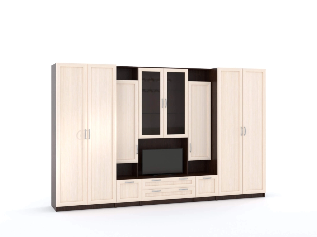Изысканная Стенка Микс, изготовленная в классическом стиле, позволит наполнить комнату атмосферой уюта и комфорта. Стенка оборудована разнообразными закрытыми и открытыми полками, где можно разместить книги, элементы декора. 2 больших двухстворчатых шкафа помогут разместить любые вещи. Также предусмотрена небольшая тумба под телевизор, выдвижные ящики для хранения различных вещей. У нас можно заказать стенку различных цветов и размеров.