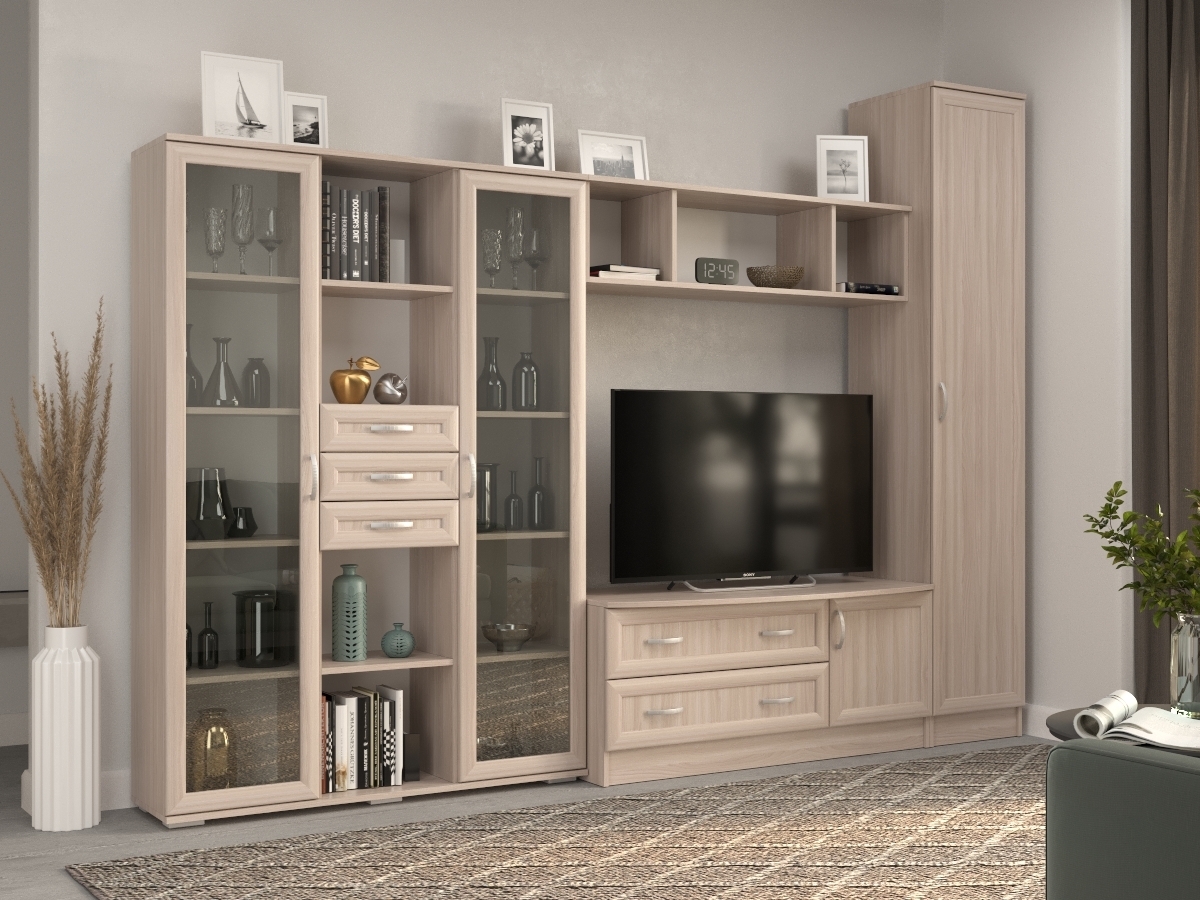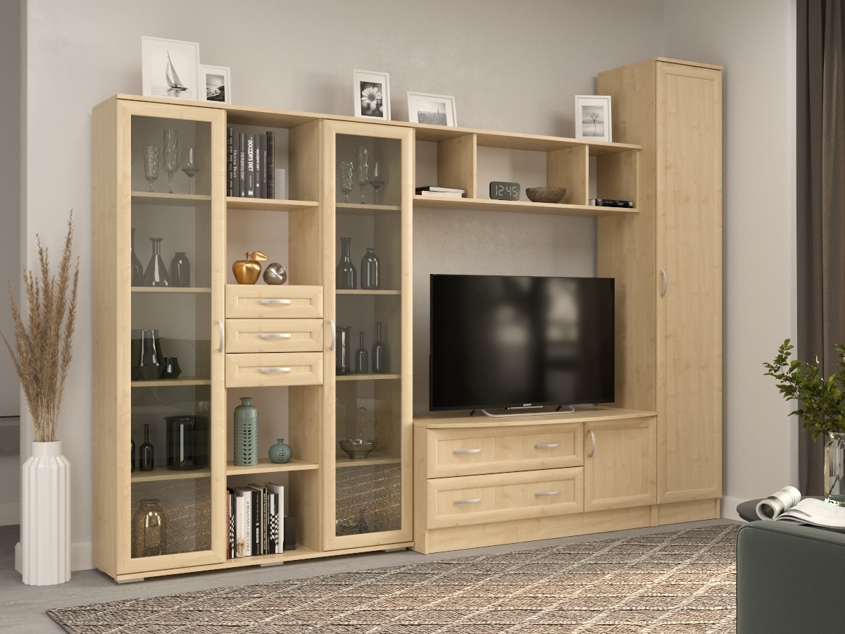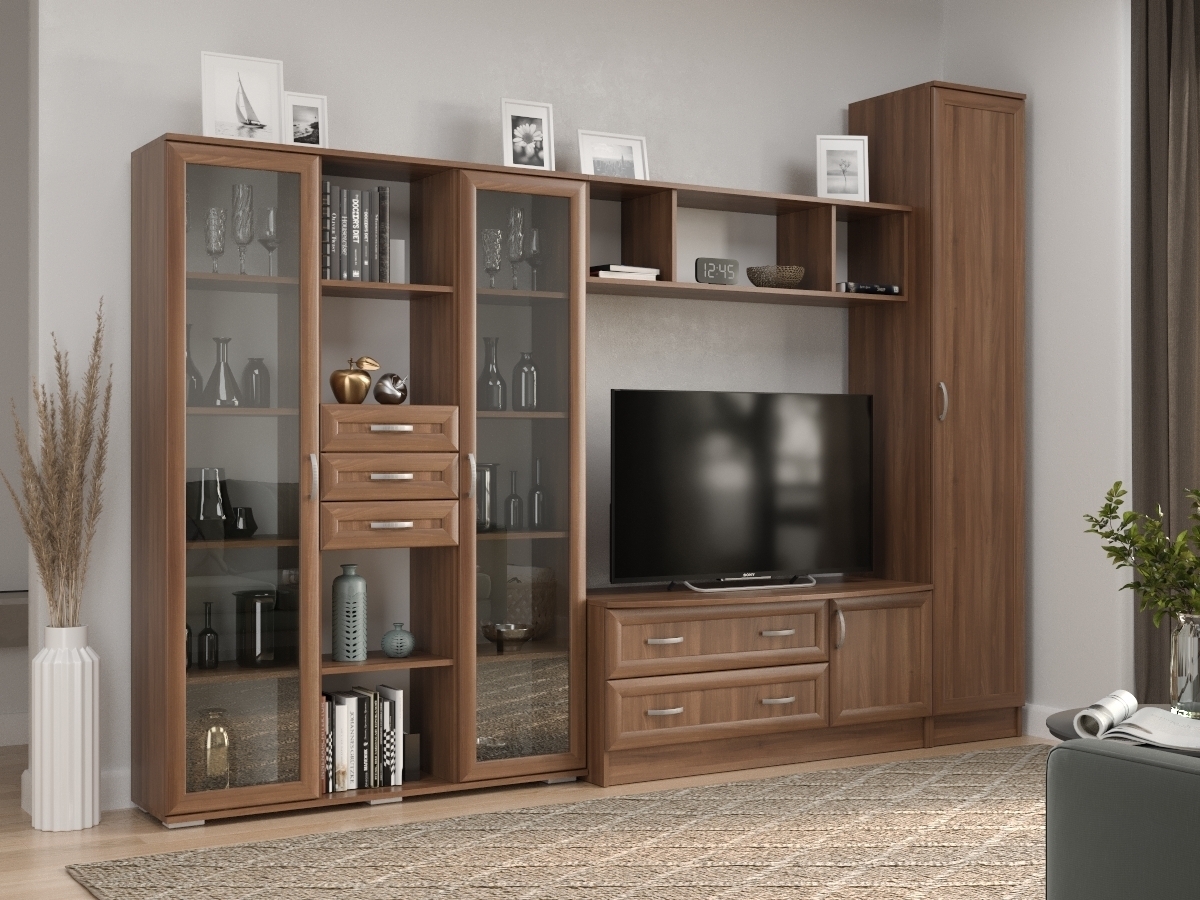 Изысканная Стенка Ольга, изготовленная в классическом стиле, позволит наполнить комнату атмосферой уюта и комфорта. Стенка изготовлена из ламинированного ДСП и МДФ, оборудована разнообразными полками, где можно разместить книги, элементы декора. Также предусмотрена тумба под телевизор, выдвижные ящики для хранения различных вещей. У нас можно заказать стенку различных цветов и размеров.