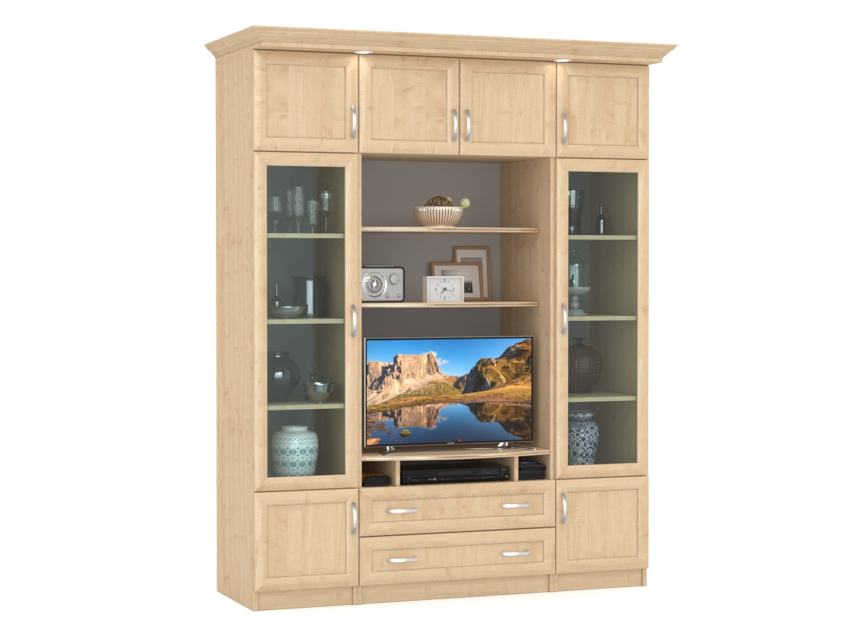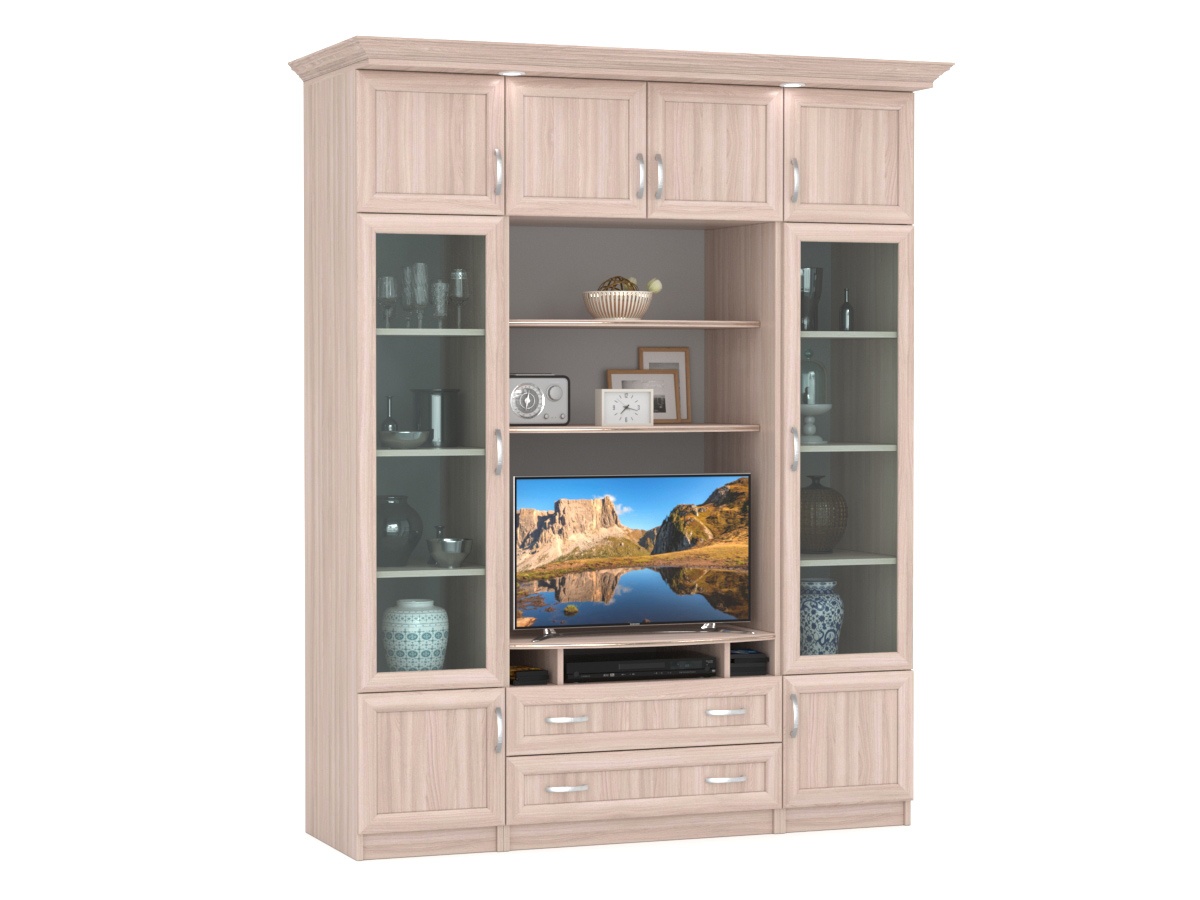 Изысканная Стенка Олимп-7М, изготовленная в классическом стиле, позволит наполнить комнату атмосферой уюта и комфорта. Стенка оборудована разнообразными полками, где можно разместить книги, элементы декора. Также предусмотрена тумба под телевизор, выдвижные ящики для хранения различных вещей. У нас можно заказать стенку различных цветов и размеров.