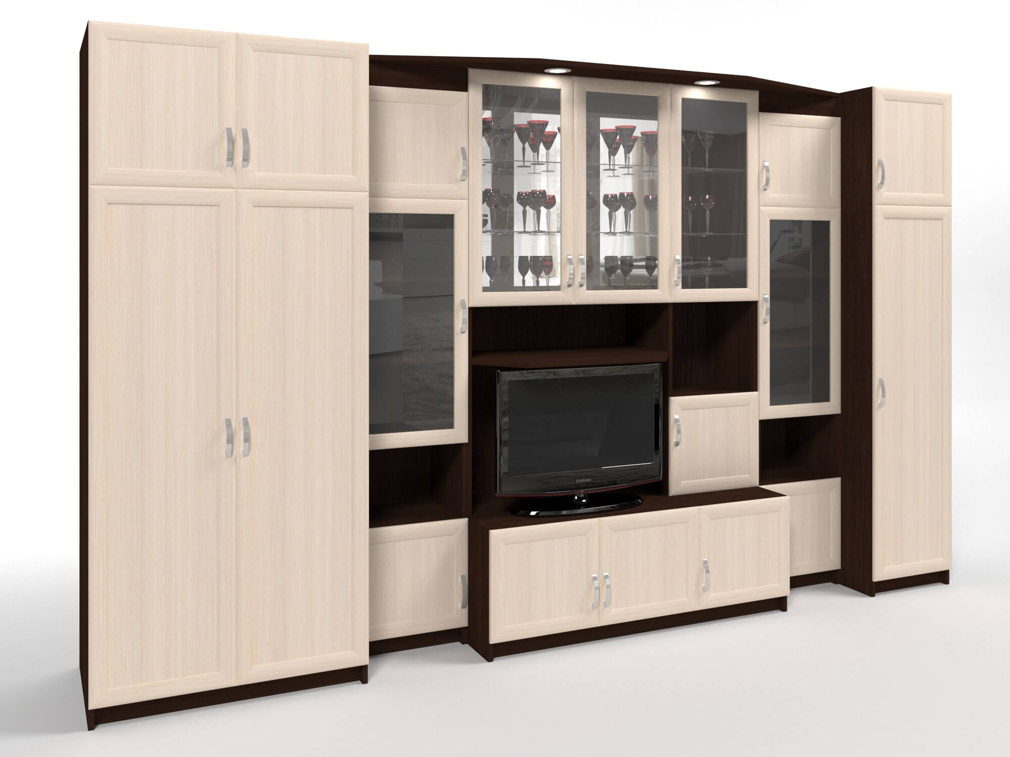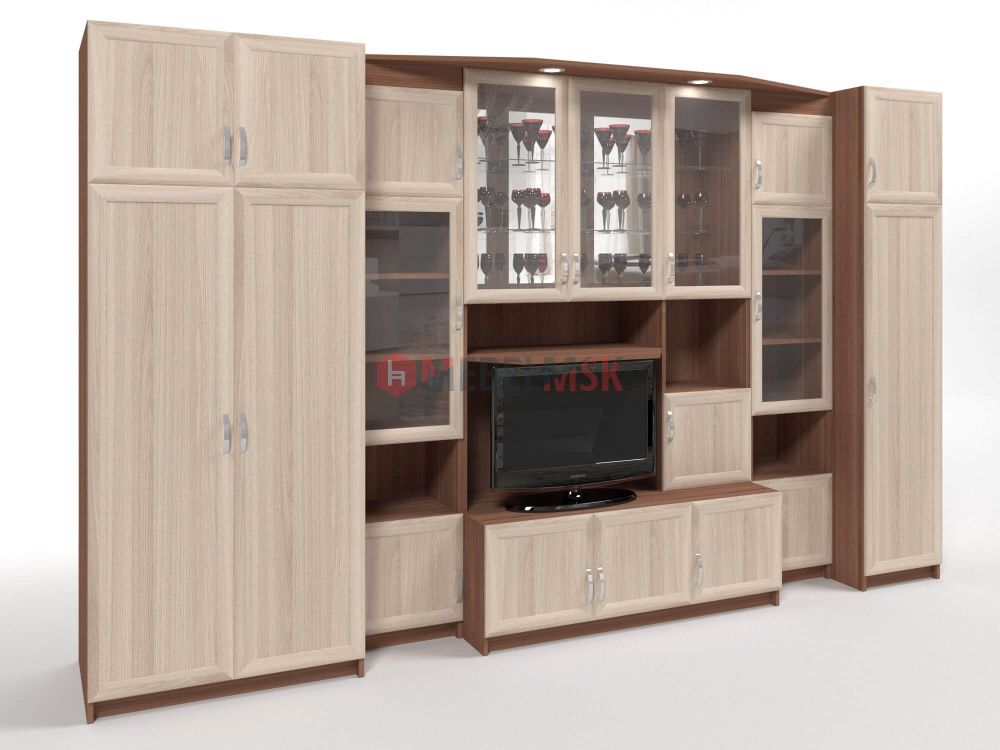 Изысканная Русь - 70 МДФ Стенка, изготовленная в классическом стиле, позволит наполнить комнату атмосферой уюта и комфорта. Стенка изготовлена из ламинированного ДСП, оборудована разнообразными полками, где можно разместить книги, элементы декора. Также предусмотрена тумба под телевизор, выдвижные ящики для хранения различных вещей. У нас можно заказать стенку различных цветов и размеров.