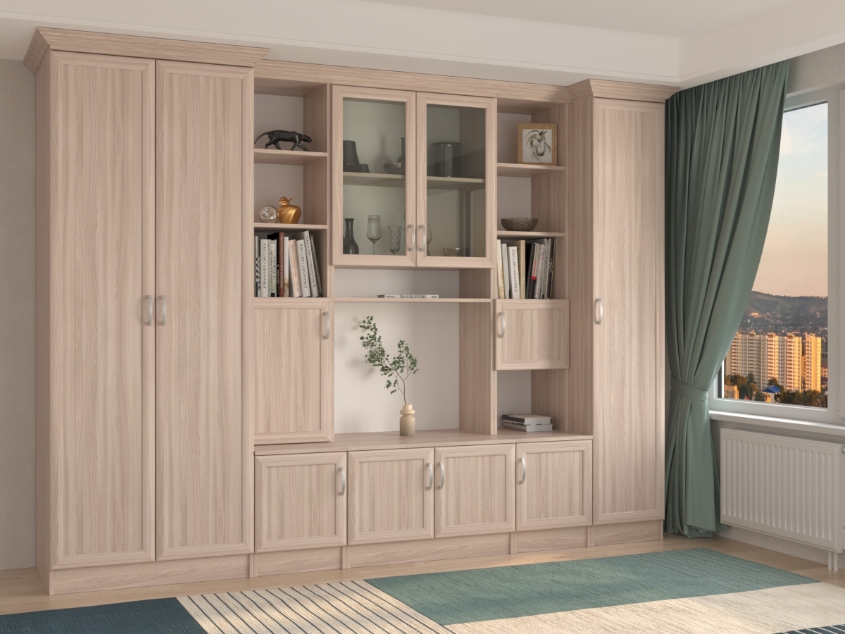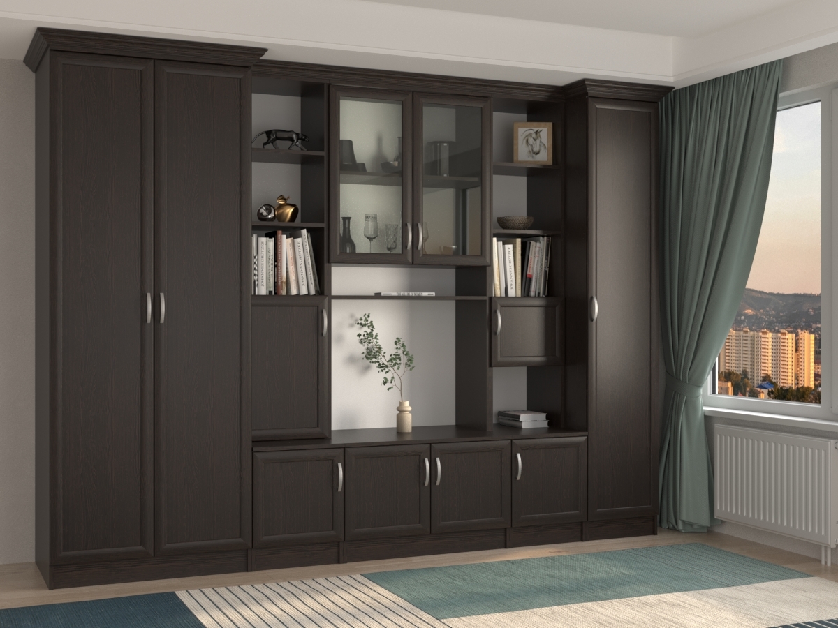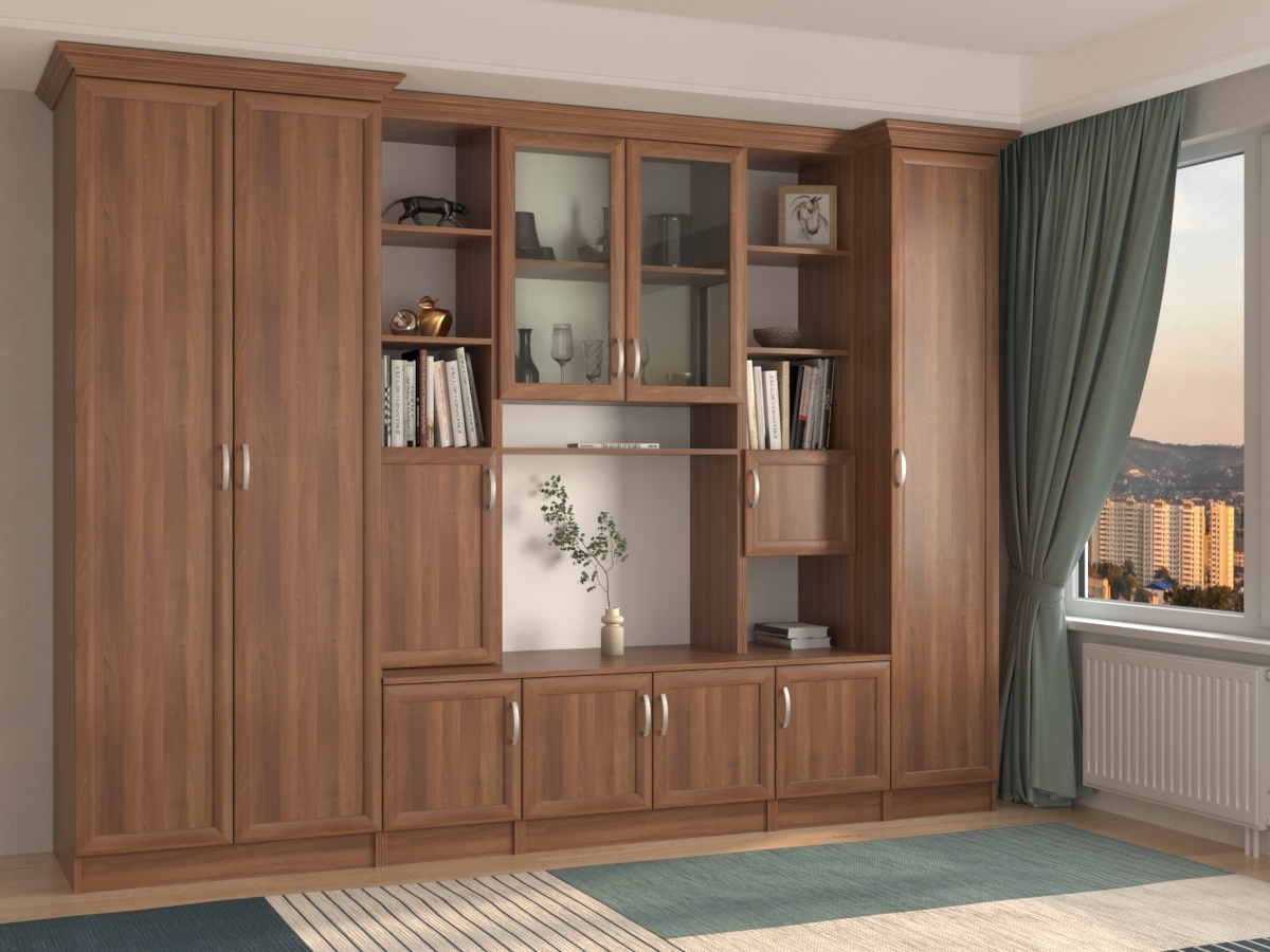 Изысканная Трио (2+1) Стенка, изготовленная в классическом стиле, позволит наполнить комнату атмосферой уюта и комфорта. Стенка оборудована разнообразными полками, где можно разместить книги, элементы декора. Также предусмотрена тумба под телевизор, шкаф и пенал для хранения различных вещей. У нас можно заказать стенку различных цветов и размеров.