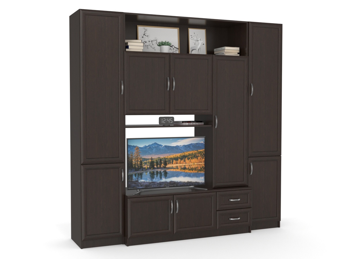 Стенка Валерия 10К представляет собой типичный вариант комфорта и практичности. С виду не очень большая стенка, занимающая минимальное количество места в комнате, обладает достаточной вместительностью. Это удачное сочетание стиля модерн и лучших традиций. Имеются 2 серванта со стеклянными дверцами, открытые полки, секретер, место под TV, тумба и выдвижные ящики, а также пенал.